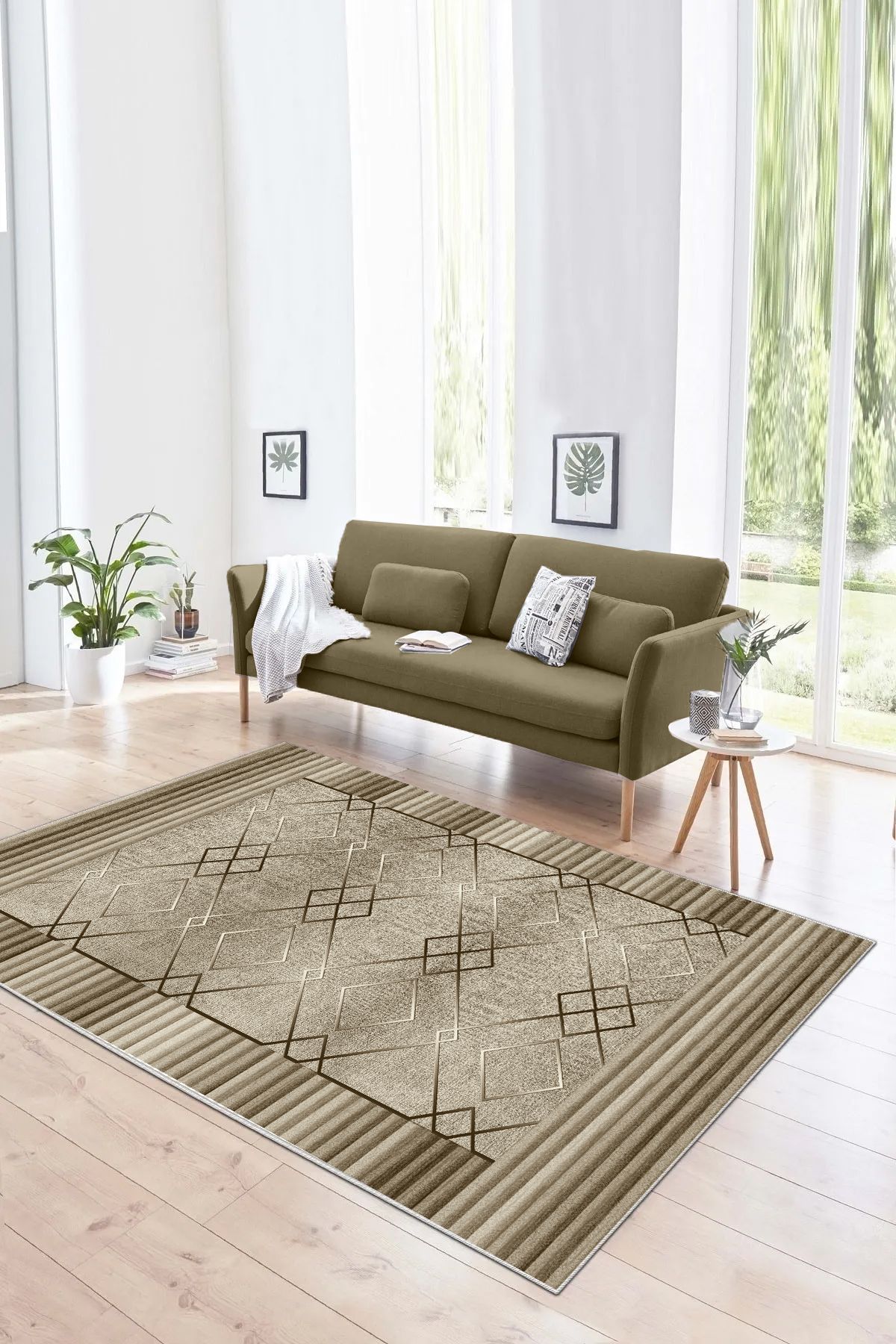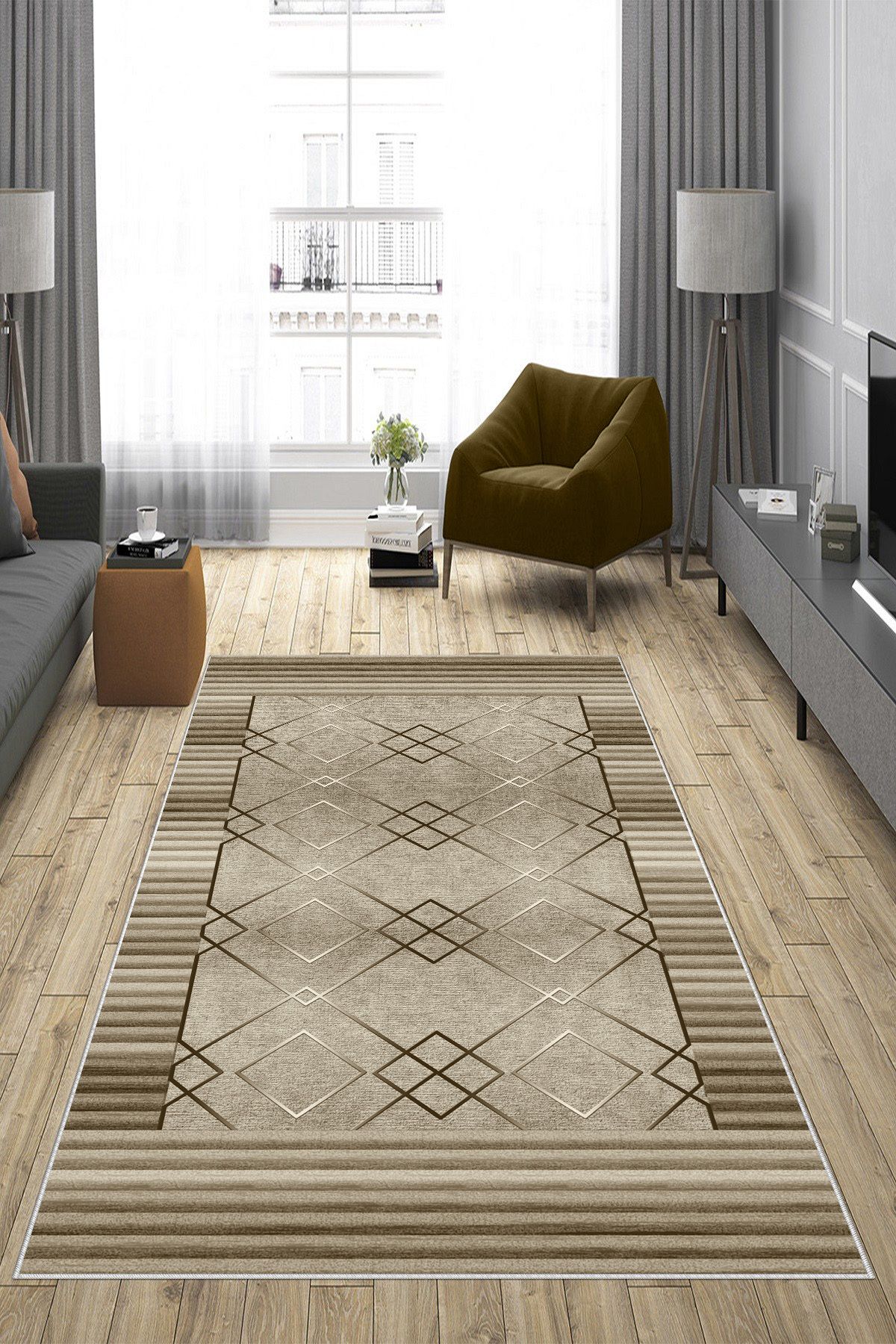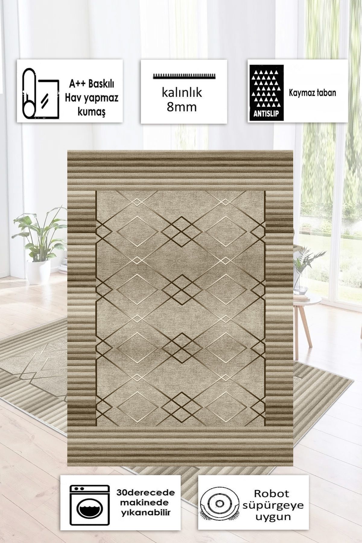 Geçişli Dokulu Çerçeveli Desen Kahve Renk Kaymaz Taban Yıkanabilir Dijital Baskı Halı Yolluk